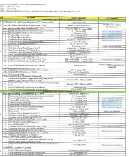 KALENDER AKADEMIK UNIVERSITAS ISLAM NEGERI SULTAN SYARIF KASIM RIAU TAHUN AKADEMIK 2025/2026
