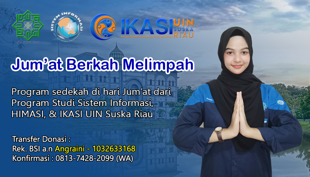 Bagi bapak/ibu/saudara/i sekalian yang ingin berdonasi untuk kegiatan rutin ini, dapat mentransfer dananya ke alamat rekening Bank Syariah Indonesia (BSI) No. Rek. 1032633168 atas nama Angraini. Kegiatan ini dapat terselenggara berkat kerjasama antara Program Studi Sistem Informasi, Ikatan Keluarga Alumni Sistem Informasi (IKASI), dan Himpunan Mahasiswa Sistem Informasi (HIMASI).