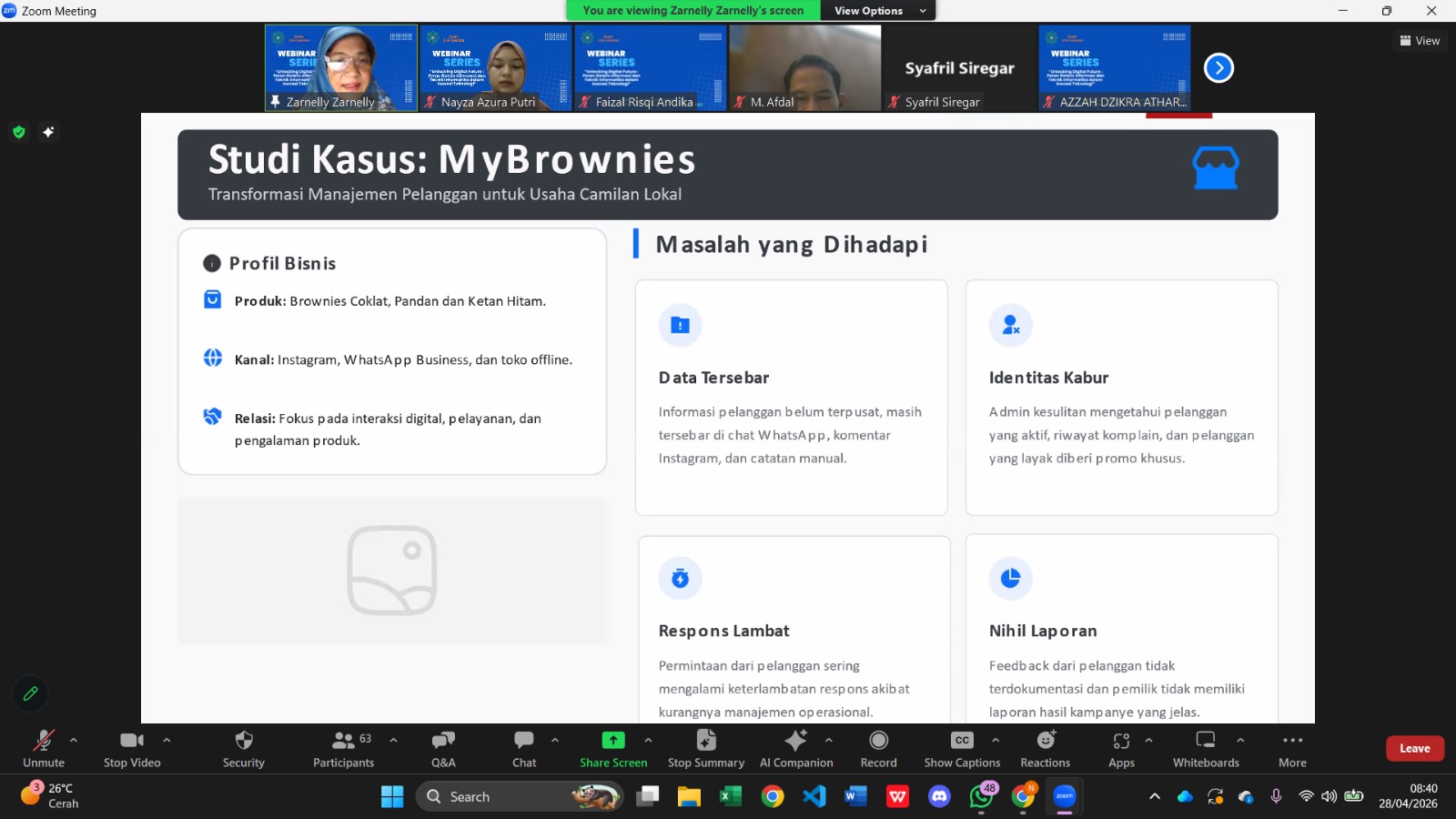 Pemaparan materi oleh Ibuk Zarnelly, S.Kom., M.Sc. mengenai studi kasus transformasi manajemen pelanggan pada usaha lokal MyBrownies.