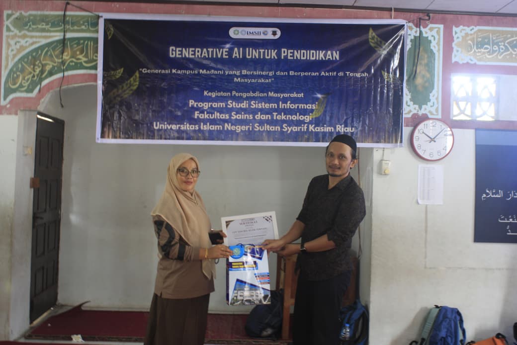 Generative AI, sebagai salah satu bentuk kecerdasan buatan yang mampu menghasilkan teks, gambar, hingga audiovisual, dinilai memiliki potensi besar untuk mempermudah guru dalam menyusun materi ajar yang kreatif dan inovatif. Dosen selaku narasumber memberikan plakat penghargaan kepada Kepala UPT SDN 002 Terpadu Kuok sebagai simbol apresiasi atas kerja sama dan penyambutan yang hangat.